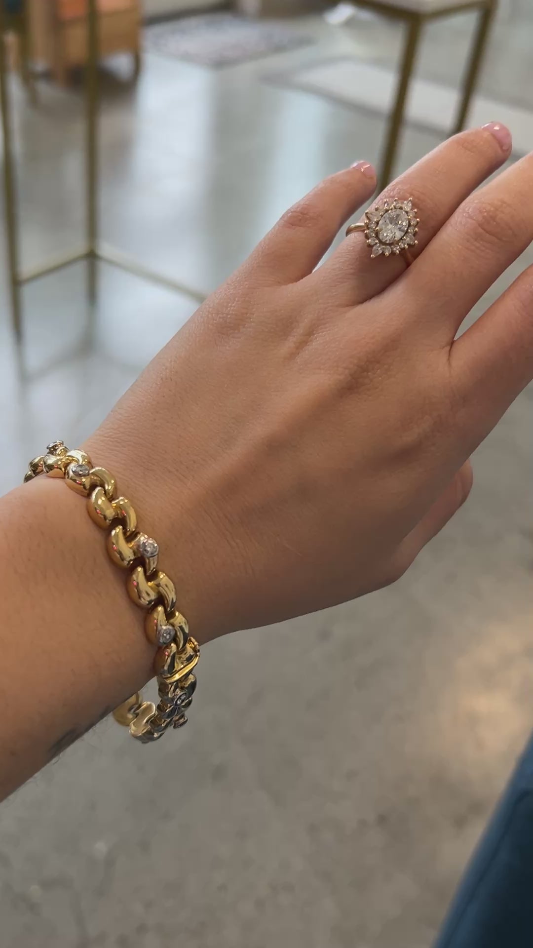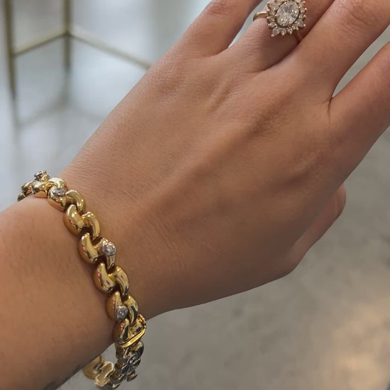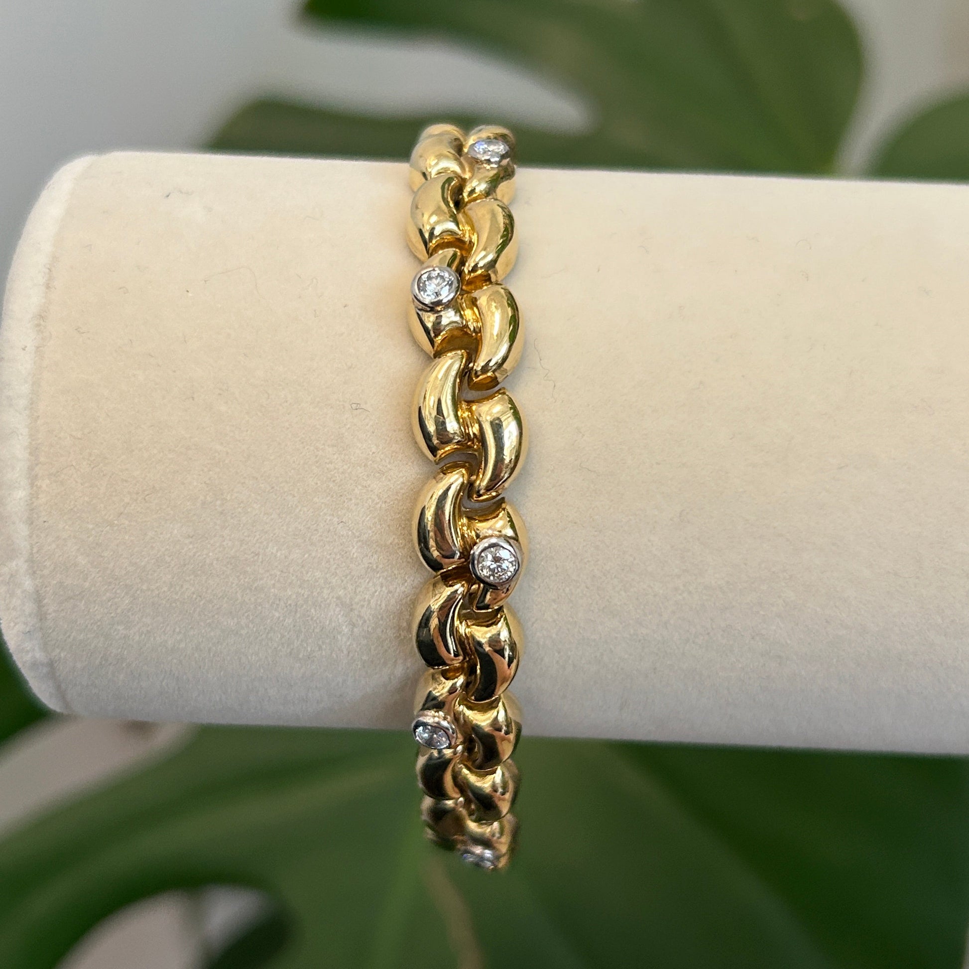 A timeless statement piece crafted in luxurious 18K solid gold. This bracelet features bold, rounded links with a silky high polish finish, beautifully accented by bezel set diamonds that add a touch of sparkle to every movement. Sophisticated, versatile, and designed to elevate any look from everyday chic to special occasions.